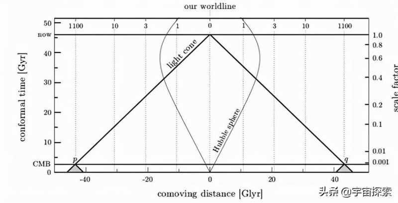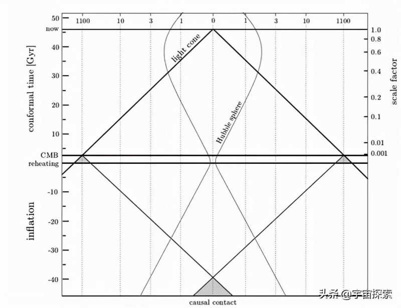 CMB那一条黑线对应的是宇宙诞生38万年的时刻,下方阴影部分代表具有因果联系的部分,可以看出,在那一时刻具有因果联系的区域远远小于如今可观测宇宙的范围(整个三角形的底边)。