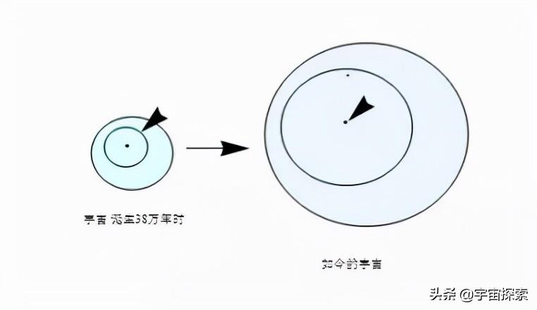 下图表示一个气球的膨胀过程。小一点的气球代表38万年时的宇宙,大一点的是如今的宇宙。在气球上画一个圈,假设圈上有一个光子,在宇宙诞生38万年的时刻起,开始朝着地球的方向与运动,如下图的箭头所示,然后它在漫长的宇宙中漂泊了137亿年后终于到达了地球(大一点气球上的那个点,我们活在气球表面上!)