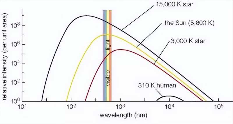 不同温度的恒星波长发射率的对数图。请注意,人类所感知的“可见光”正处于太阳最强大的辐射波长的顶峰。