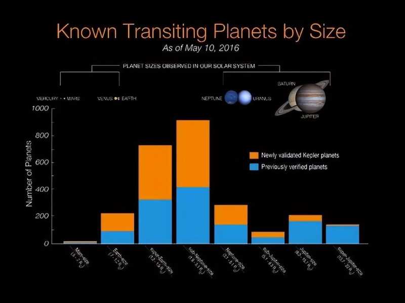 2016年发现的按大小分类的系外行星图。虽然我们对宇宙中系外行星的分布还没有完整的了解,但很明显,比地球质量大2-5倍的岩石行星是很常见的。