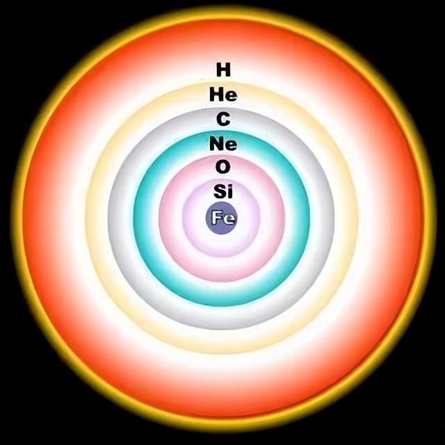 而且在特大质量的恒星核心内部触发的核聚变反应所需要的温度是非常高的,所以这样的条件就可以使其外层的温度正好达到氢核聚变所需的反应条件,而在此时恒星的外层就会开始逐步的发生核聚变反应,一层一层的进行着不同的核聚变反应,只要恒星的质量足够的大,在其内部的反应就可以一直进行下去,从氕到氘,再从氘和氕聚变成氦三,再从氦三聚变成氦四,再到碳、氧、氖、镁、硅、硫、钙,直到铁元素……