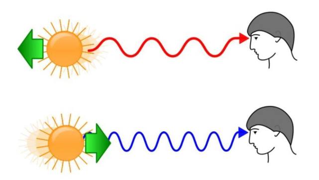 火车快到站时通常会鸣笛,当火车向你驶来时,你会听到鸣笛声越来越尖锐,当火车远离你时,鸣笛声会越来越低沉,这声波的波长同样会像光波波长那样被压缩拉伸,进而听到不同频率的声音。