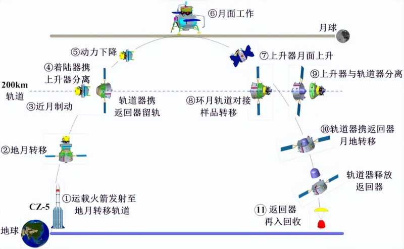 当登月舱上升段升空后,人带着月土转移到返回舱,然后上升段与轨道舱分离,最后轨道舱点火变轨进入地月轨道,返回舱与服务舱分离,独立返回地球。最终返回舱进入地球轨道,减速掉入大气层。