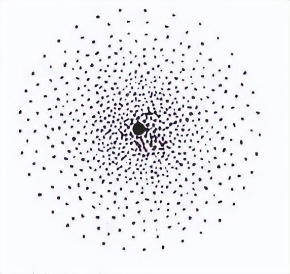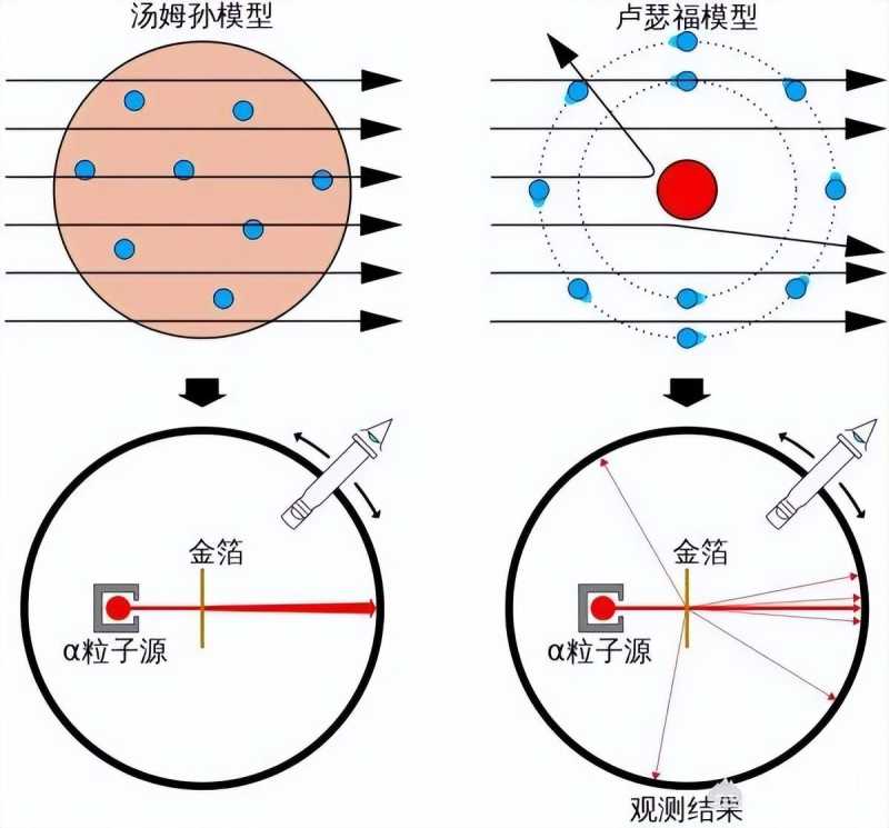 图示:从前人们认为原子的质量均匀分布在原子中,即整个原子是一个大致均匀的实体,就像宏观概念中的一个密度均匀的球。但卢瑟福用放射性材料释放的阿尔法粒子去穿过金箔时,发现实验结果非常奇怪,大多数阿尔法粒子就像会穿墙术一般,径直穿过了金箔,只有极少数阿尔法粒子的方向发生了很大变化,就像台球和台球相撞那样的变化。
