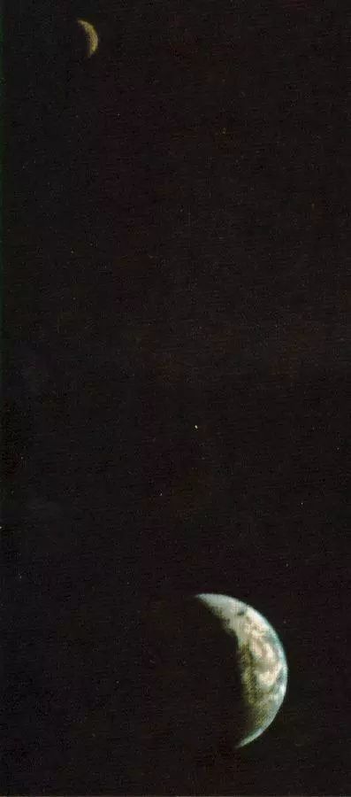 从月球出发,继续飞行,地球和月球的样貌就会一起呈现在我们面前。下图就是旅行者一号飞船拍摄的地球月球照片,当时距离地球大约1200万公里。