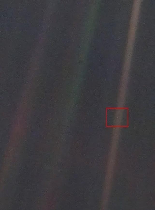2013年,旅行者一号飞船在距离地球60亿公里的地方拍摄了一张照片,非常经典的照片,被称为“暗淡蓝点”。从下图可以看出,地球就是红色的方框里的蓝白色斑点,如果不是特殊标注,我们很难发现地球的存在。