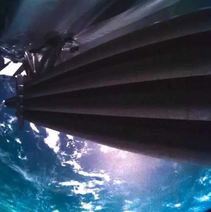 JMC1位于航天器的前面,斜向上看,可以看到其中一个太阳能电池阵列的一部分,最终将看到部署的天线。