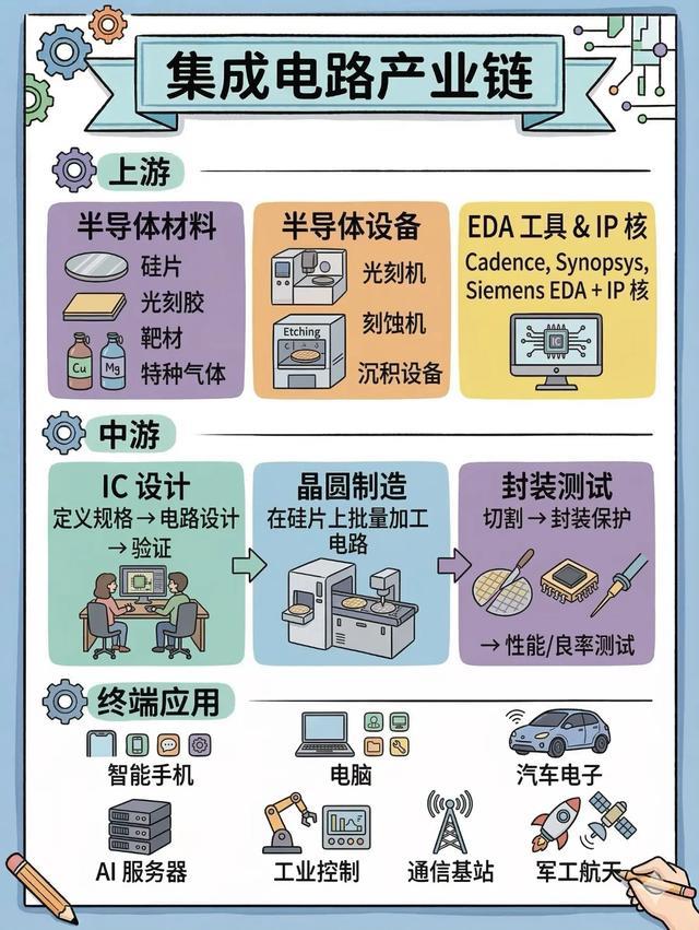 集成电路产业链是全球最复杂的工业体系之一,分为上游、中游、终端应用三大环节,缺一不可。