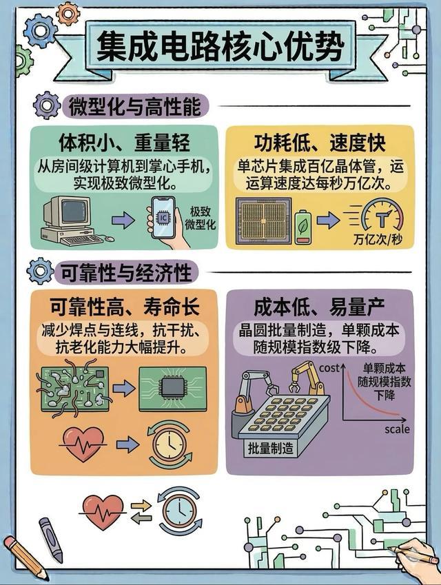 集成电路最核心的优势,就是极致的微型化与高性能: