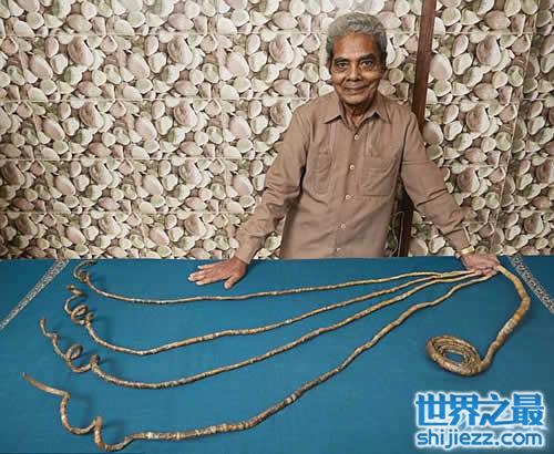 78岁的印度男子史立达尔基亚(Shridhar Chillal),其左手五指指甲长度总和达到9.09米。超越了此前记录保持者美国女子李萌德的8.65米。史立达尔基亚从16岁的时候开始,就再也没有剪过左手上的指甲,这一手指甲留了整整62年。现在最长的是拇指指甲长达2米,其次是1米86的中指指甲、1米81的无名指指甲、1米79的小指指甲和1米64的食指指甲......【查看详情】