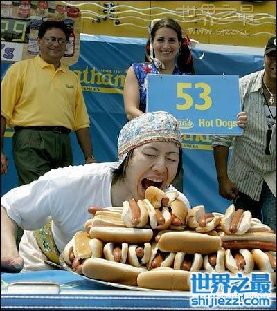 在日本的一次“大胃王”比赛中,日本选手小林尊以12分钟吞下53个半热狗的成绩再次力压群雄,夺走了“冠军黄带”,同时刷新了自己前年创造的12分钟、50个半热狗的纪录。现年26岁的小林尊体重仅60公斤,比许多大块头的美国选手小巧不少。