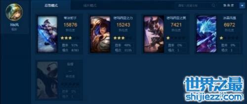 这正是来自祖安ID为X秋风的一名玩家,在他的使用英雄列表里,除了奎因、凤凰以及盲僧仅仅使用过一场之外(用完之后发现并没有熟悉的寒冰与盖伦有意思),他的游戏生涯里只有8783场次的寒冰以及3135场次的盖伦。