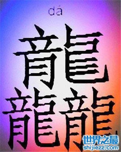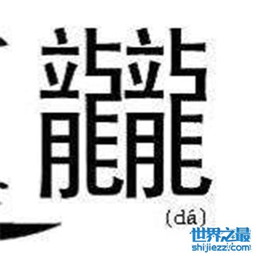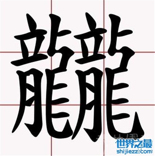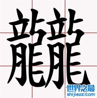最新出版的修订本《汉语大词典》收录了4个繁体龙字合并的字,共有64画,是我国汉字中笔画最多的。以前出版的《汉语大字典》只收录了两个繁体龙字合并的字。但《中华大字典》、《字汇和字汇补》和《康熙字典补》中均收录了字。《汉语大字典》解释此字说:二龙、三龙均音dá,龙行貌。四龙音zhé,义为“唠唠叨叨,话多”,并认为四龙是“詟”的异体字。《说文言部》:“詟,一曰言不止也。”(据《咬文嚼字》)
