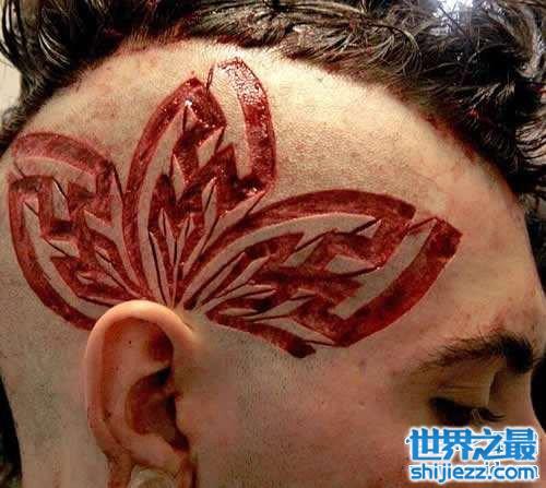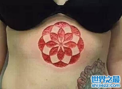 割肉纹身听着名字都让人感觉到害怕,顾名思义,就是通过割自己的肉,来形成一个图案,并在这图案中灌入染料。从而形成一个精美的纹身。这种纹身的恐怖之处就在于它需要割下自己的肉来形成,简直是伤心病狂啊!我想只有一些有自残怪癖的人才会去选择这种纹身吧?这其实也还不是割肉纹身最恐怖之处,它还会危及生命的。