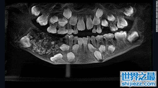 光片显示情况异常,医生决定为他做进一步的检查。手术发现,这名男孩的下颚上有一个明显的袋状肿块,里边包含526颗牙齿。