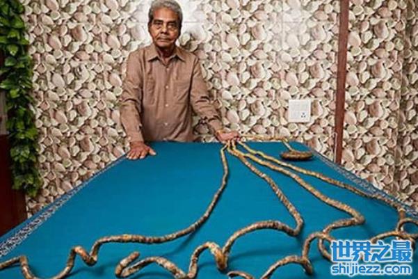 印度人浦那拥有世界上最长的指甲,他的指甲已经有60多年没有剪过了,经过测量他的指甲有909.6厘米长。指甲太长会对他的日常生活造成巨大的困扰,在坚持了那么多年之后,他决定剪掉他的指甲,并在里普利的展览上展出。