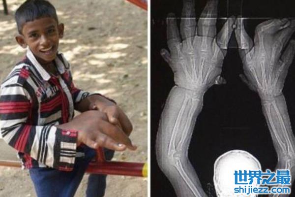 世界罕见巨指症男孩和刘华一样,手指非常的粗壮,双手的重量更是高达12.7公斤,不过这样对比起来,刘华似乎病情更加严重,因为他单单只是一只左手就几乎要和这个男孩的双手一样重了,不过刘华比较幸运的是,已经接受了巨指症切除手术。