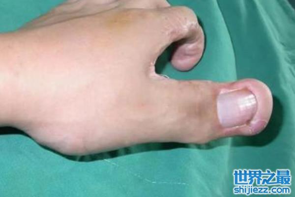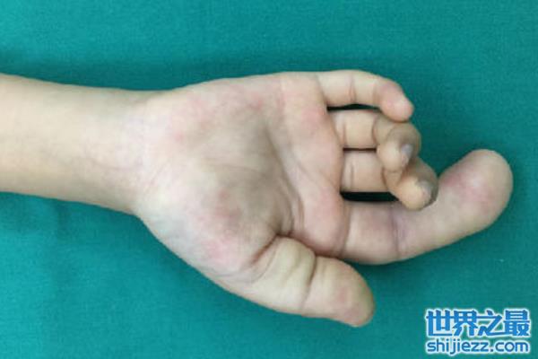 而在这五个指头中,不仅仅只有食指变得粗壮,其他的手指也有不同程度的肥大和肿胀,其中拇指是仅次于食指的,长度为26厘米,而中指就更短一些,但是也达到了15厘米的长度,因此他几乎无法使用左手做任何的事情,因为他的手指几乎粗到无法弯曲。