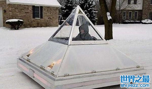 这辆车子是相当奇妙的金字塔电动车,也就是梦幻车123,它可以通过太阳能来提供动力。虽然在外表上看很像金字塔实际上装备的像装甲车。