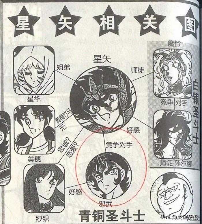 最开始车田设定的男主宿敌,其实是独角兽座邪武,从银河战争宣传发布会上跟星矢互怼,以及回忆中抢着给城户纱织当马,以及两人的星座配对——同为奇蹄目的天马跟独角兽,甚至颜值方面都对应了车田的成名作《拳王创世纪》,星矢对应高岭龙儿,邪武对应剑崎顺。