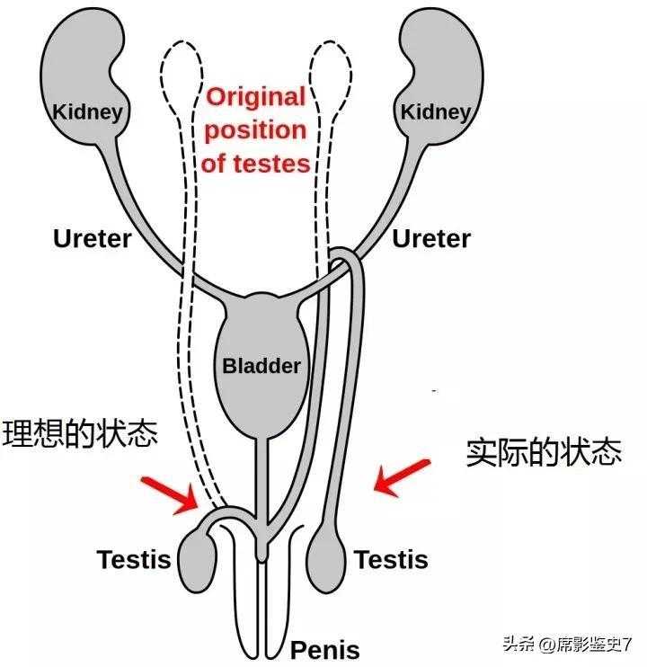如此一来,输精管需要绕一大圈才能绕开盆骨和输尿管。其实我们从胚胎发育也能看出来这一进化过程,男婴儿的睾丸也是在体内的,是随着发育成型,才落入到阴囊之中。