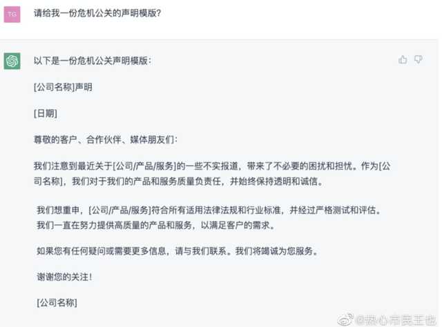 以娱乐行业最常见的危机公关声明或道歉声明为例,ChatGPT的水准比半数的明星和其工作人员的水准可能都高: