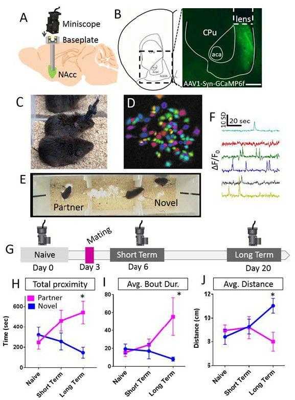 研究通过对草原田鼠交配前和交配后NAc中进行体内Ca2+成像来展现配对行为的形成和成熟在大脑中是如何表现的。结果表明长期同居会导致更强烈的配对结合偏向,作者进一步提出这种配对结合偏好是否反映在NAc神经元活动的模式中的疑问。性幼稚的动物在交配前无偏好;在交配后短期测试中,动物对伴侣或新动物之间无显著偏好差异;而在长期测试中均表现出强烈的伴侣偏好行为(图1H-J)。