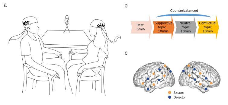 论文第一作者龙宇航博士毕业于北京师范大学认知神经科学与学习国家重点实验室,目前为北京师范大学“励耘”博士后,研究兴趣是亲密关系下的社会交流与互动,前期研究揭示了触觉交流促进亲密关系的神经机制(https://mp.weixin.qq.com/s/tM00e6zO7fw-u_Wvyu1cDA),本研究在前期工作的基础上进一步探讨了情绪对亲密关系下社会互动的影响作用。该研究招募了22对情侣和22对异性朋友。在实验过程中,每对情侣或异性朋友分别完成支持性、中性及冲突性话题的讨论任务(图2a-b)。研究采用基于近红外光谱成像(fNIRS)的超扫描技术,同时测量了每组两名被试的脑功能活动(图2c)。