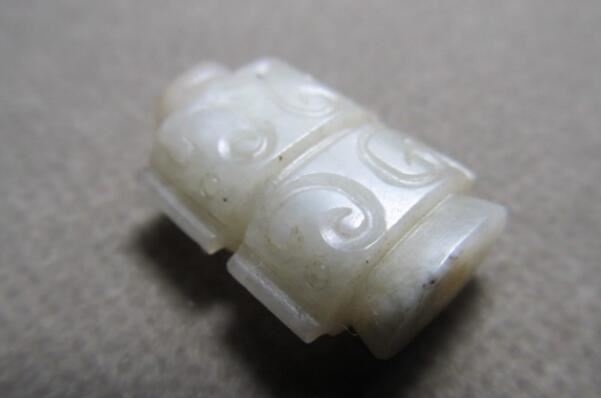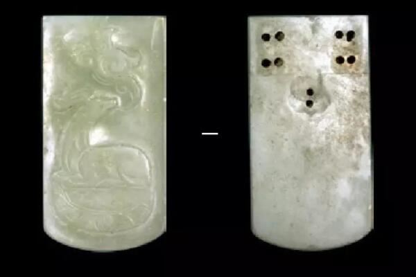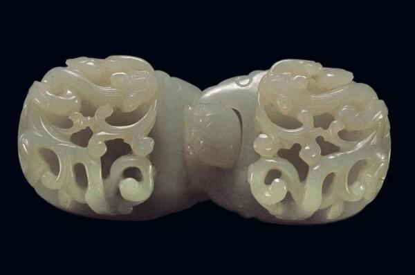 这个玉器利用通体莹白,局部分布有红褐色晕斑的白玉制作,是南宋时代玉器,从四川广汉市和兴乡联合村出土,是在器物的正面利用镂雕和圆雕技法雕琢出一只身体盘曲的大螭,和一只体态温顺的小螭。