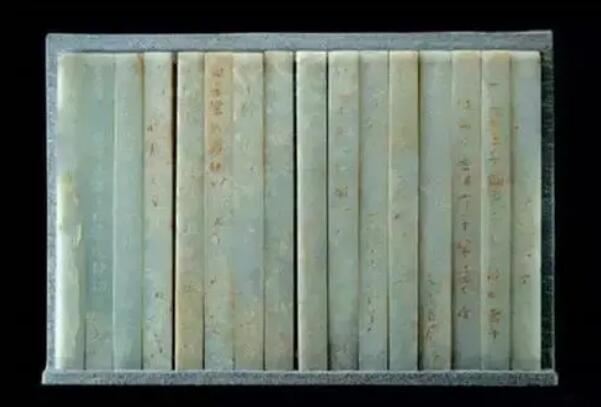这个十六简玉册长29.8厘米,款2厘米,目前收藏在台北故宫博物院中,该玉册是利用青白色的玉石制作,每个简之间用金线进行串联制作,而这个楷体的册文,上面书写的字根据残存的笔划推测,大概是宋太祖、太宗的谥号。