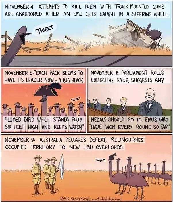 在这之后,鸸鹋战争成为了一段传世佳话,被冠上了史上最耻辱战争的称号,而澳大利亚也成为了唯一一个跟鸟类开战的国家,并且是唯一一个被鸟打败的国家。