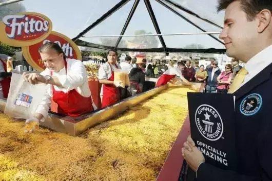 2012年10月1日,在美国达拉斯举办的德克萨斯州博览会上,吉尼斯世界纪录的官员在观看厨师Drew Deckman添加奶酪,后者正在制作世界上最大的炸辣椒饼。整块饼重量超过600公斤,是为了庆祝Fritos油炸玉米片诞生80周年而特制的。