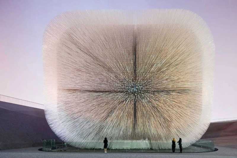 英国馆周身插满了6 万根中空透明的触角般的杆件,每根杆子里都放置了种类各异的植物种子,这些杆件随风微微飘动,像是一株风中的蒲公英 / ©Heatherwick Studio