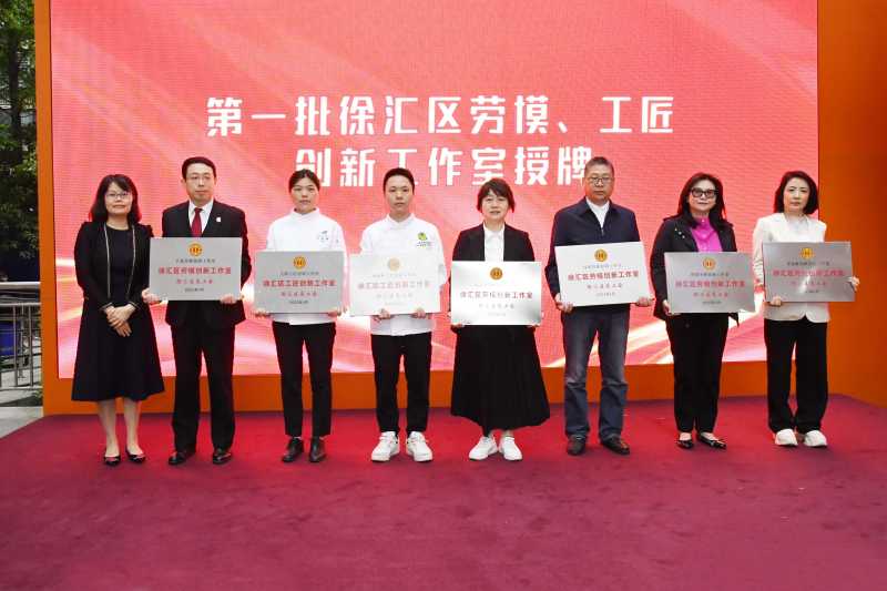 25岁的刘福焕,从事烘培技能已经9年,成为能工巧匠。日前,他作为烘培技能的教练,刚刚陪伴参赛选手走下上海市第一届职业技能大赛的舞台。今天,徐汇区华泾镇北杨党群服务中心,他再一次走上台,领取自己的“刘福焕工匠创新工作室”标识牌。现场,包括“刘福焕工匠创新工作室”在内的新一批徐汇区劳模(工匠)创新工作室揭牌成立,未来将以此为空间载体,开展一系列活动,助力创新攻关、技能传授、人才培养、岗位练兵。