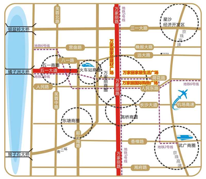 地处湖南长、株、潭三市融城的核心商业圈--万家丽商圈;四通八达的交通优势,不论自驾、地铁亦或是往返机场、高铁、市中心,均十分快捷通畅。