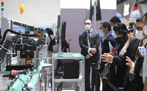 2020年11月6日,在进博会技术装备展区,人们在西门子展台观看人机协作的智能化单元生产线。新华社记者 李任滋 摄