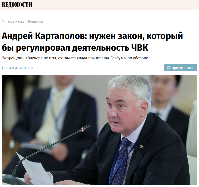 当地时间6月25日,俄罗斯国家杜马(议会下院)国防委员会主席安德烈·卡尔塔波洛夫(Andrey Kartapolov)接受俄罗斯商业日报(Vedomosti)采访时表示,俄罗斯需要一部用于规范私营军事公司活动的法律,国家杜马正在研究是否可能在不久的将来起草相关法案并使之通过。
