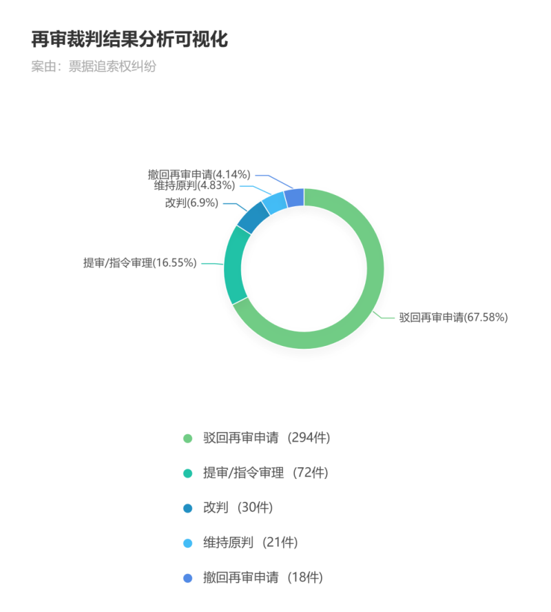 票据追索权纠纷案件的申请再审率为1%左右,其中超过三分之二被驳回再审申请,再审改判率仅为6.9%。
