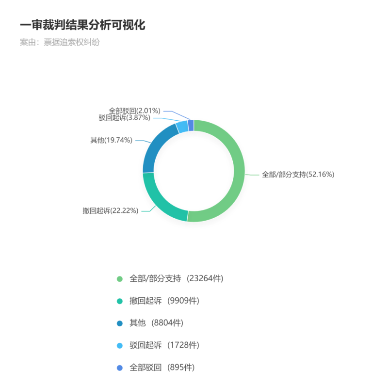 票据追索权纠纷案件的一审裁判结果超过一半为全部或部分支持原告诉讼请求;另外超过五分之一为原告撤回起诉,此种情况大概率为原被告双方在判决之前达成了清偿协议,协商一致撤诉结案;诉讼地位极其被动的被告抗辩成功大获全胜的概率仅为2.01%。