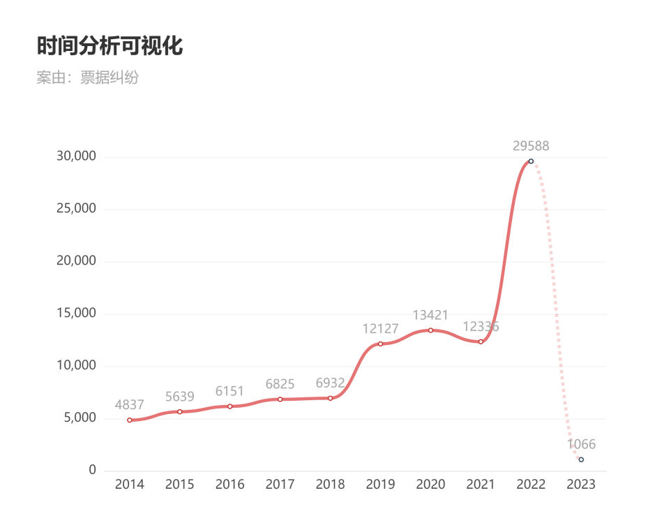 截至2023年3月18日,alpha法律智能操作系统同步公布的中国大陆地区票据纠纷案件司法文书累计106361件,其中2019年为12127件,首次突破一万件;2020年至2021年也许由于新冠疫情等原因,案件数量变化不大;2022年主要由于房地产行业商票暴雷等原因,目前已公布的数量已达29588件。