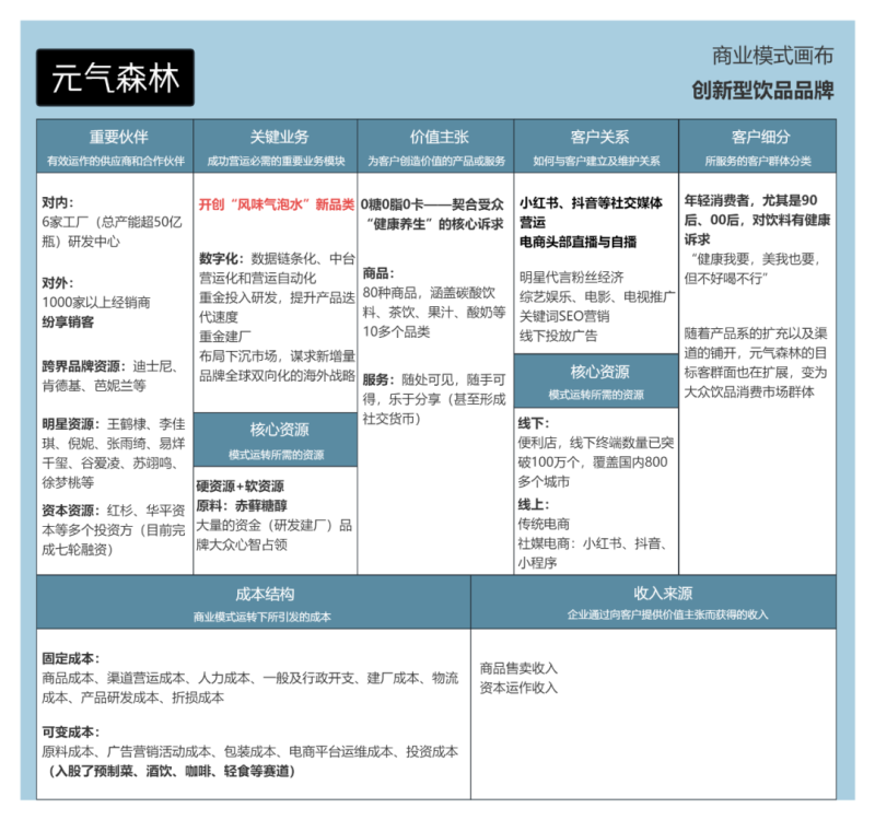 作为新品类的开创者,凭借口味上的优势,元气森林享受到了先行者的红利,相信看完这张元气森林的商业模式画布,你对元气森林的成功会有一个更直观的认知。