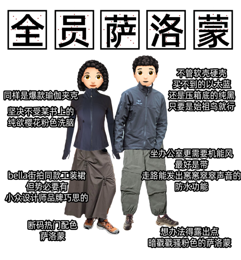 2022年,小红书发布过一份《2022时尚行业未来消费灵感图鉴》,“山系穿搭”是 2022 年的热门趋势之一。在山系话题下,目前已有8万+篇笔记,博主们向粉丝展示如何将户外运动产品与休闲服饰混搭,打造有型又休闲的山系造型。萨洛蒙是高频出现的穿搭单品。