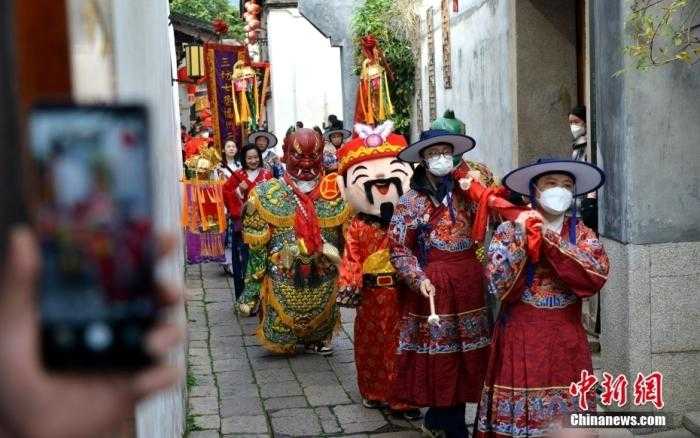 图为福州三坊七巷天后宫举行“迎财神”民俗巡游活动,吸引许多人驻足观看。吕明 摄