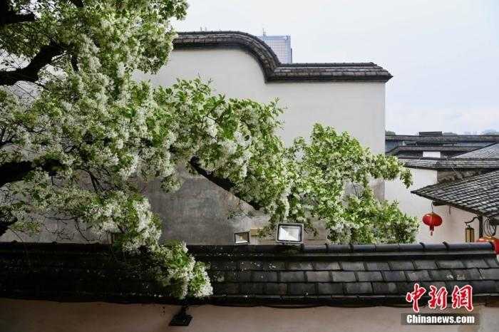 福建福州,三坊七巷里花朵盛开的百年流苏树与古厝相互映衬。中新社记者 王东明 摄