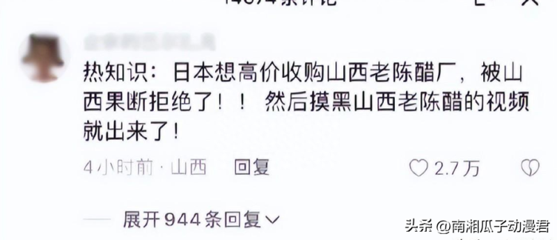 或许是被醋厂拒绝,日方资本就开始蓄意报复。发动资本的力量,对山西陈醋引导舆论,铺天盖地的进行抹黑我国优秀产业。