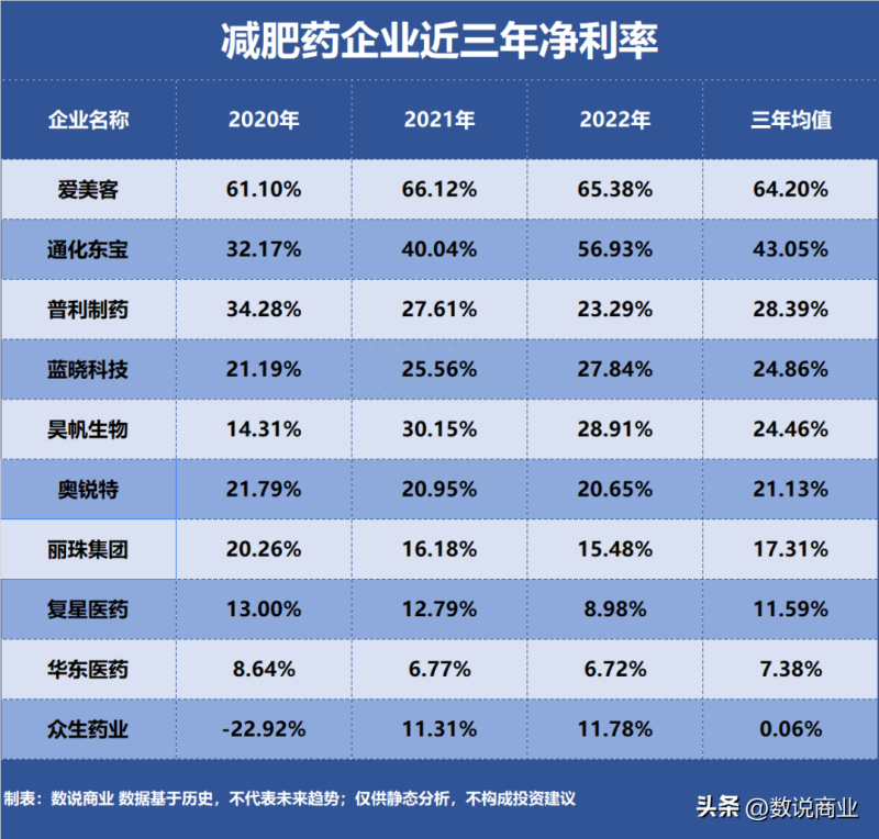减肥药盈利能力前十企业,近三年净资产收益率、毛利率、净利率: