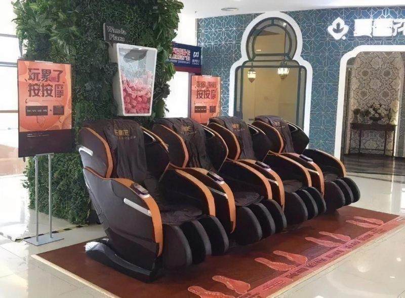除此之外,近年来,收费按摩椅也开始进入电影院、商场等更多公共场所。一些电影院的大厅里,也可以看到数十个按摩椅排列,而座椅区可能只有几排。