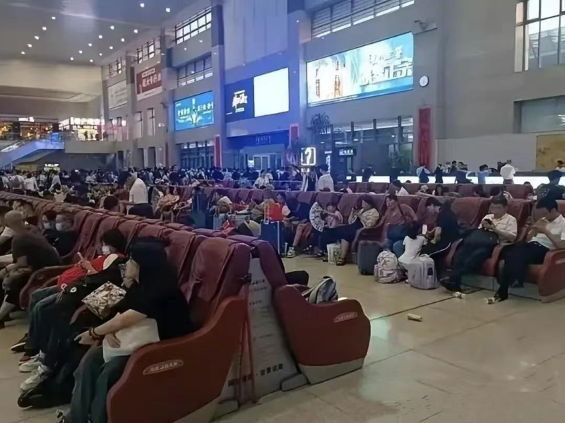 据统计,该站候车厅右侧有6排红色按摩椅,左侧10排蓝色按摩椅,加在一起超过400个。这导致许多乘客只能在地上坐或寻找阶梯处歇脚。