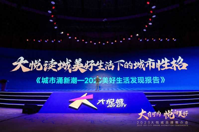 (照片:2023大悦城品牌推介会) 02 洞悉“城市涌新潮”,释放原生文化力量 “城市涌新潮”,洞悉美好生活图景 站在16周年的新起点,大悦城控股商业在会上发布业内首创的《城市涌新潮——2023美好生活发现报告》,历时两个月时间,通过3000份调研问卷、2000万大悦城有效会员交易数据、13座大悦城重点布局城市、18-45岁研究客群,从宏观趋势、青年客群画像以及大悦城的运营实践成果三个方面,对当下年轻消费者的美好生活进行解构,成功勾勒出13座城市的十三种性格。