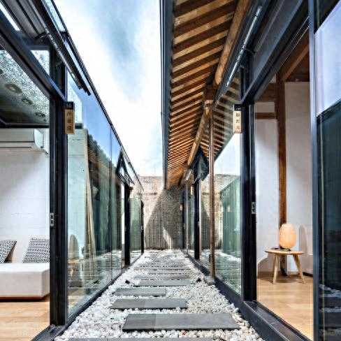 胡同民宿所处的院落位于西打磨厂街210号,为东城区挂牌保护院落。原为瑞华染料行旧址,建于民国年间,是近代中型商铺的代表,后逐渐变为普通的民居杂院使用。2016年全部腾退完成后,对院落进行了修缮改造。新的设计兼具了老北京的古城风韵和都市时尚的简约现代设计,形成了自己独特又强烈的建筑风格。